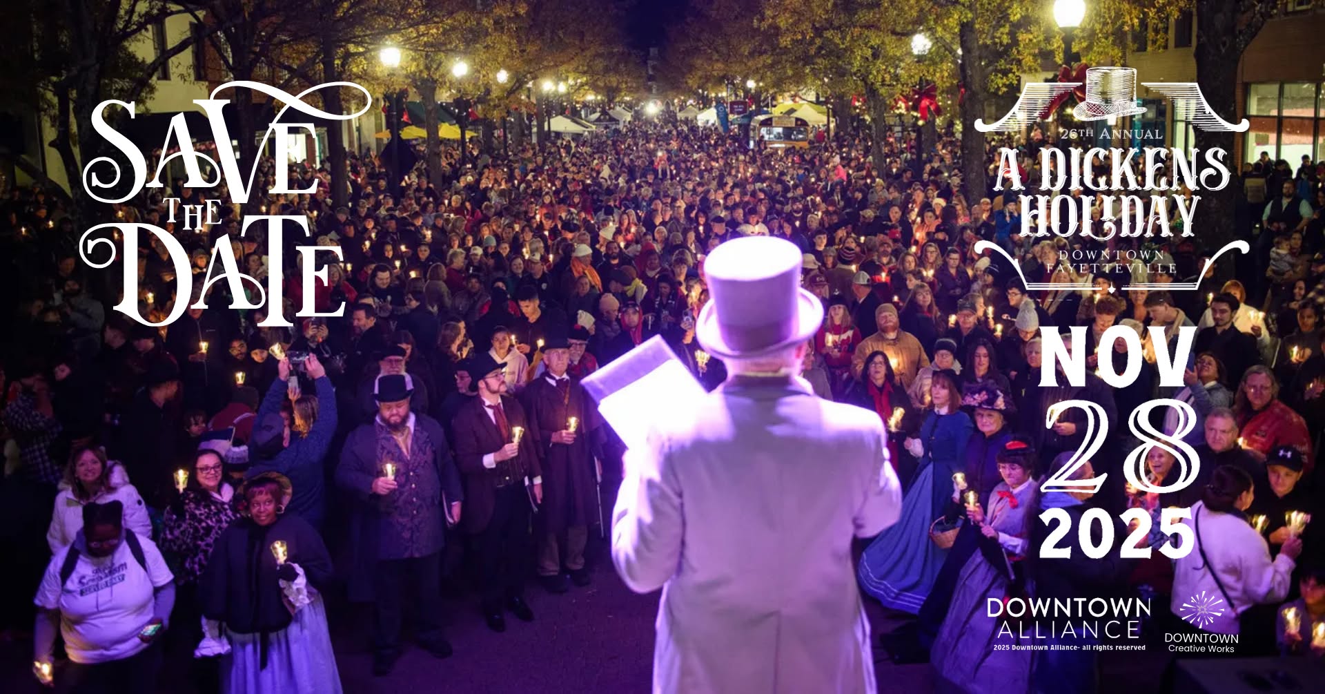 "A Dickens Holiday" returns to Downtown Fayetteville on Friday, November 28, 2025, beginning at noon. Step back in time and enjoy holiday shopping, seasonal food and drink, roving Dickens characters such as Father Christmas and the cast of A Christmas Carol, live performances of The Nutcracker, holiday songs from the Gilbert Glee singers, carolers, and the Magic of John Tudor. Special ticketed experiences include the elegant Royal Tea and Tour with the Royal Court at the Sandford House, an afternoon with Professor Elliott Engel, a delightful Horse Drawn Carriage Ride through downtown, and the Gilbert Theater’s evening performance of "A Christmas Story." New this year is the Fezziwig Ball, a Victorian-style dance at 6:00 PM led by Dance Master Gershman, complete with light fare, refreshments, and a commemorative gift. As evening falls, join the Candlelight Procession leading to the Illumination Ceremony, when downtown bursts into a dazzling glow. The celebration continues with Dickens After Dark, featuring music, a DJ, and the Gingerbread House Contest Awards at 7:30 PM. At 6:00 PM, the Elves’ Night Off: Guide to Yuletide Nights also begins — a playful evening adventure through the Social District that continues every Friday in December. Just steps away, the Opening Night of "Holiday Lights" at Segra Stadium launches a season-long wonderland of more than two million lights. For the first time in years, fireworks return at 9:00 PM, presented by Segra Stadium and visible across downtown. Dress in Victorian attire or just bring your holiday cheer — A Dickens Holiday welcomes everyone to share in the magic.