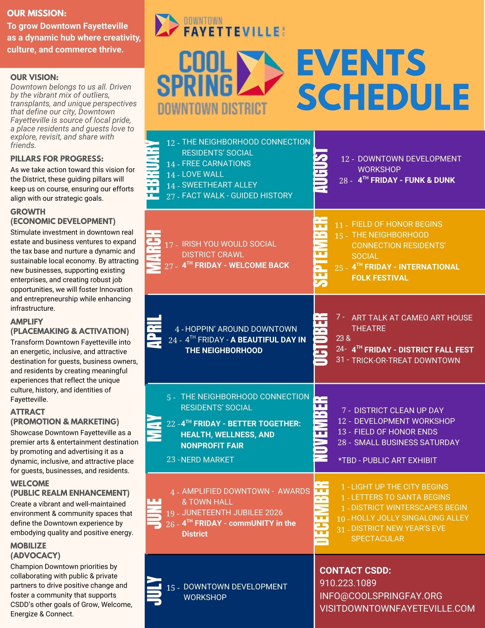Cool Spring Downtown District’s mission is grow Downtown Fayetteville as a dynamic hub where creativity, culture, and commerce thrive. Please see below for our Calendar of Events. There’s always something going on Downtown – please check our Events Calendar regularly!
